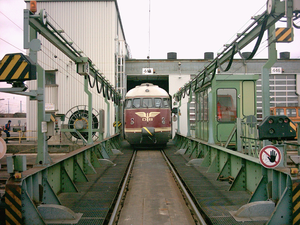 Dieser Zug war im Jahre 2002 in Seelze in der Werkstatt. Die Triebfahrzeugservicestelle Seelze hat eine Unterflurradsatzdrehmaschine, kurz URD. Hier auf dieser Maschine wurden die Räder des Museumszuges reprofiliert, was so viel heißt wie ein verschlissenes Radprofil wird abgedreht und wieder zum Originalprofil geformt.