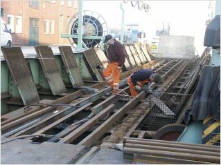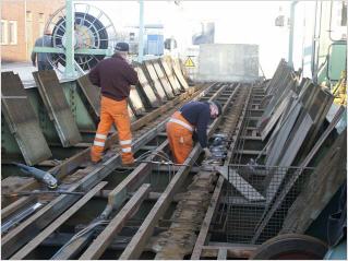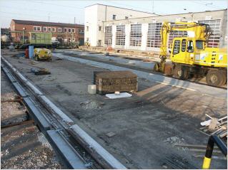 Nachdem die erste Schicht Beton abgebunden hatte, konnte kurz darauf das Schienensystem eingebaut und ausgerichtet werden. parallel dazu, die alten Böcke entfernt. Nachdem die erste Schicht Beton abgebunden hatte, konnte kurz darauf das Schienensystem eingebaut und ausgerichtet werden.